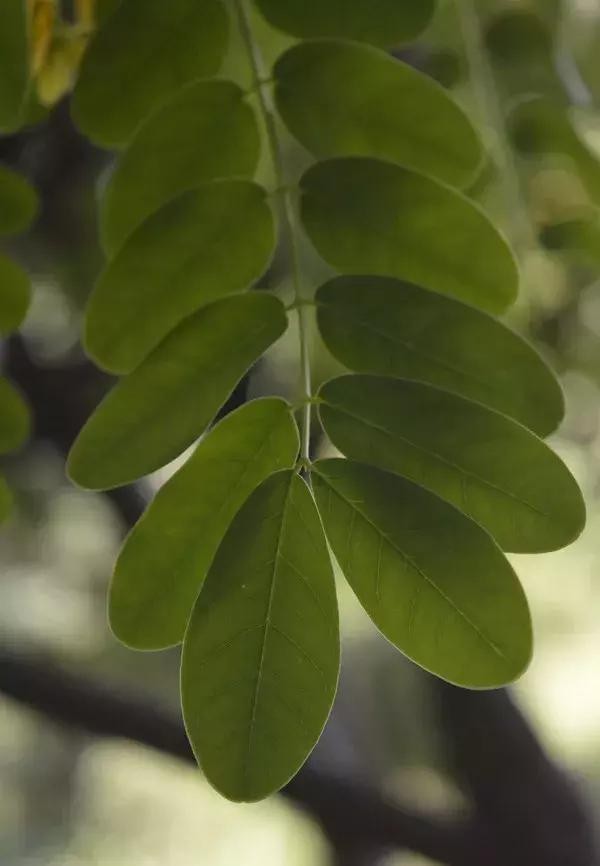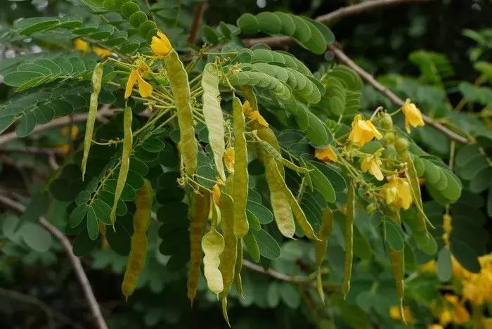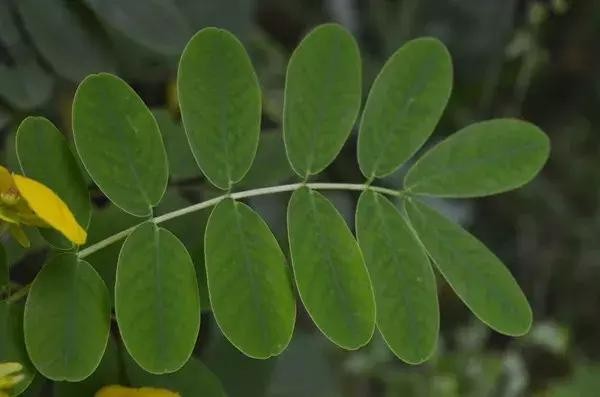 形态特征 灌木或小乔木,高5-7米;分枝多,小枝有肋条;树皮颇光滑,灰褐色;嫩枝、叶轴、叶柄被微柔毛。叶长10-15厘米;叶轴及叶柄呈扁四方形,在叶轴上面最下2或3对小叶之间和叶柄上部有棍棒状腺体2-3枚;小叶7-9对,长椭圆形或卵形,长2-5厘米,宽1-1.5厘米,下面粉白色,被疏散、紧贴的长柔毛,边全缘;小叶柄长1-1.5毫米,被柔毛;托叶线形,弯曲,长约1厘米,早落。