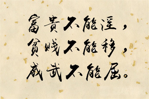 而孟子以儒家的“仁道”作为判断的准绳,纵横家就像“妾妇”无条件地顺从丈夫一样,毫无自己的原则,只知道为一己的功名迎合君主的想法,于是摇唇鼓舌、挑动战乱,破坏百姓安定的生活,是社会的破坏力量,有违“仁道”。真正的大丈夫,要坚持儒家核心价值观,就算君主用富贵功名来引诱他,用贫贱磨难来折辱他,用威权武力来胁迫他,也不能有任何动摇。我坚持的原则就是这样,君主能够认同,就带领全国人民奔小康;君主不能认同,大不了辞职走人,就像孔子所说“道不行,乘桴浮于海”。