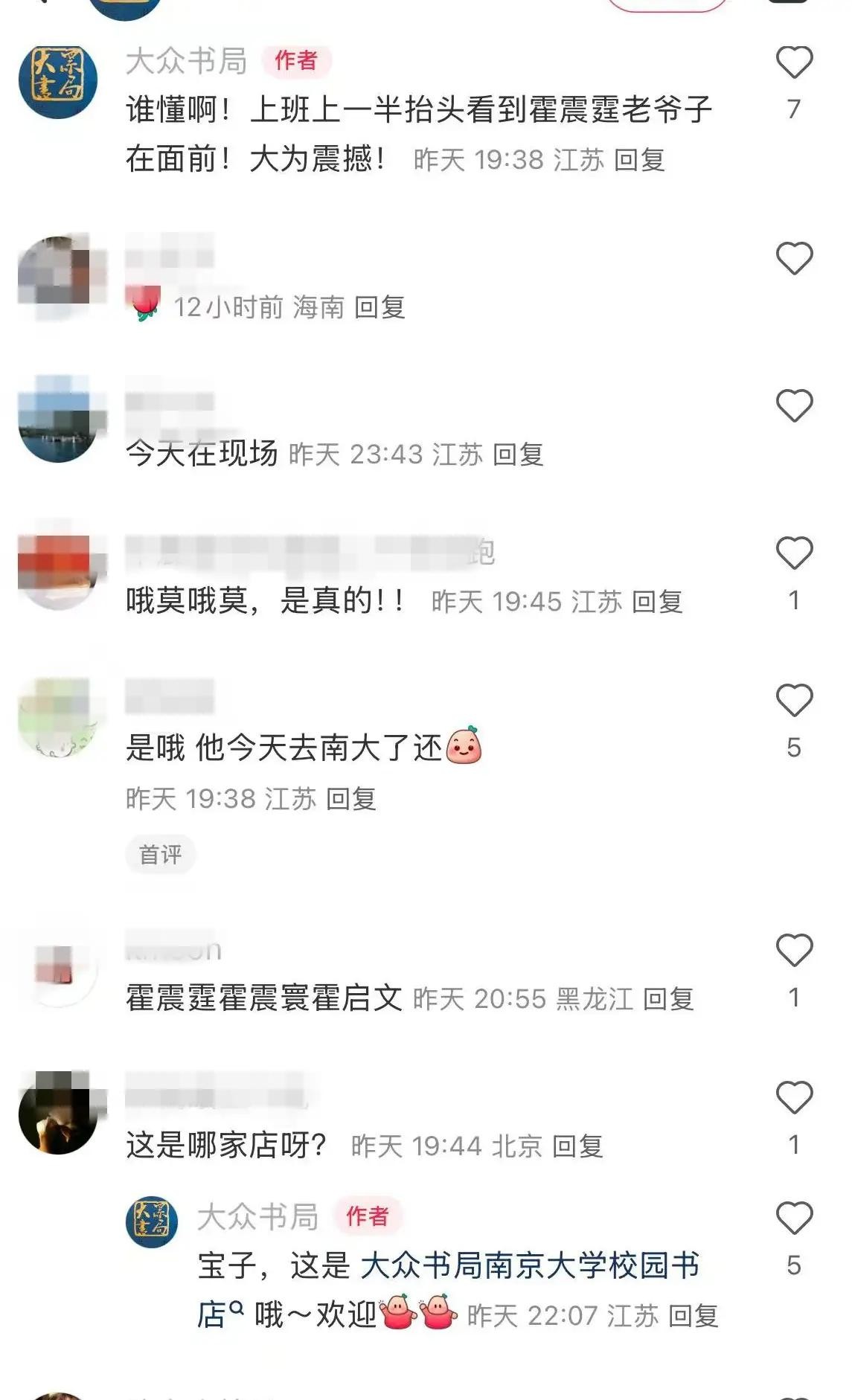 书店的工作人员也留言说:“谁能想到啊!我上班上一半,突然看到霍震霆老爷子在我面前,真是让我大吃一惊!他看起来特别亲切,完全没有架子。”