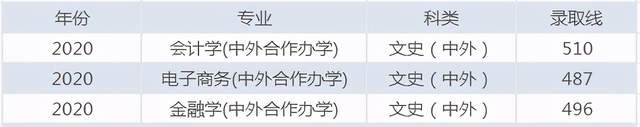 文史类也是三个专业,分数最高的专业是会计学,录取线为510分;分数最低的专业是电子商务,录取线是487分。