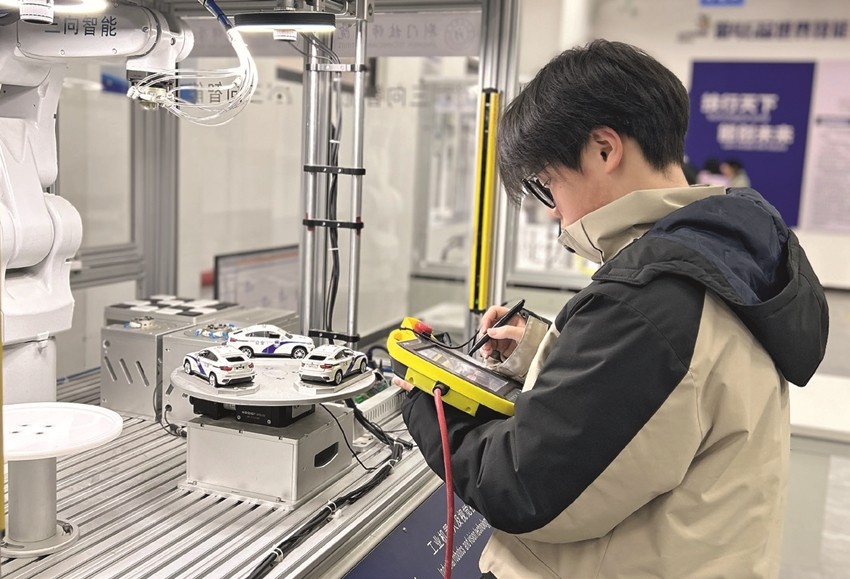在湖北省的荆门技师学院机器人系统集成实训室,一名学生正专注地操作教学版工业机器人安装汽车玻璃。“我学习的专业是智能设备运行与维护。想要熟练安装汽车玻璃,可不是一件容易的事。”17岁的马奥东对记者说,他对工业机器人很有兴趣,初中毕业后选择了技师学院继续读书,对自己毕业后的就业信心满满,“荆门本地就有很多装备制造企业,比如福耀玻璃、湖北航特等都有我的对口专业岗位”。