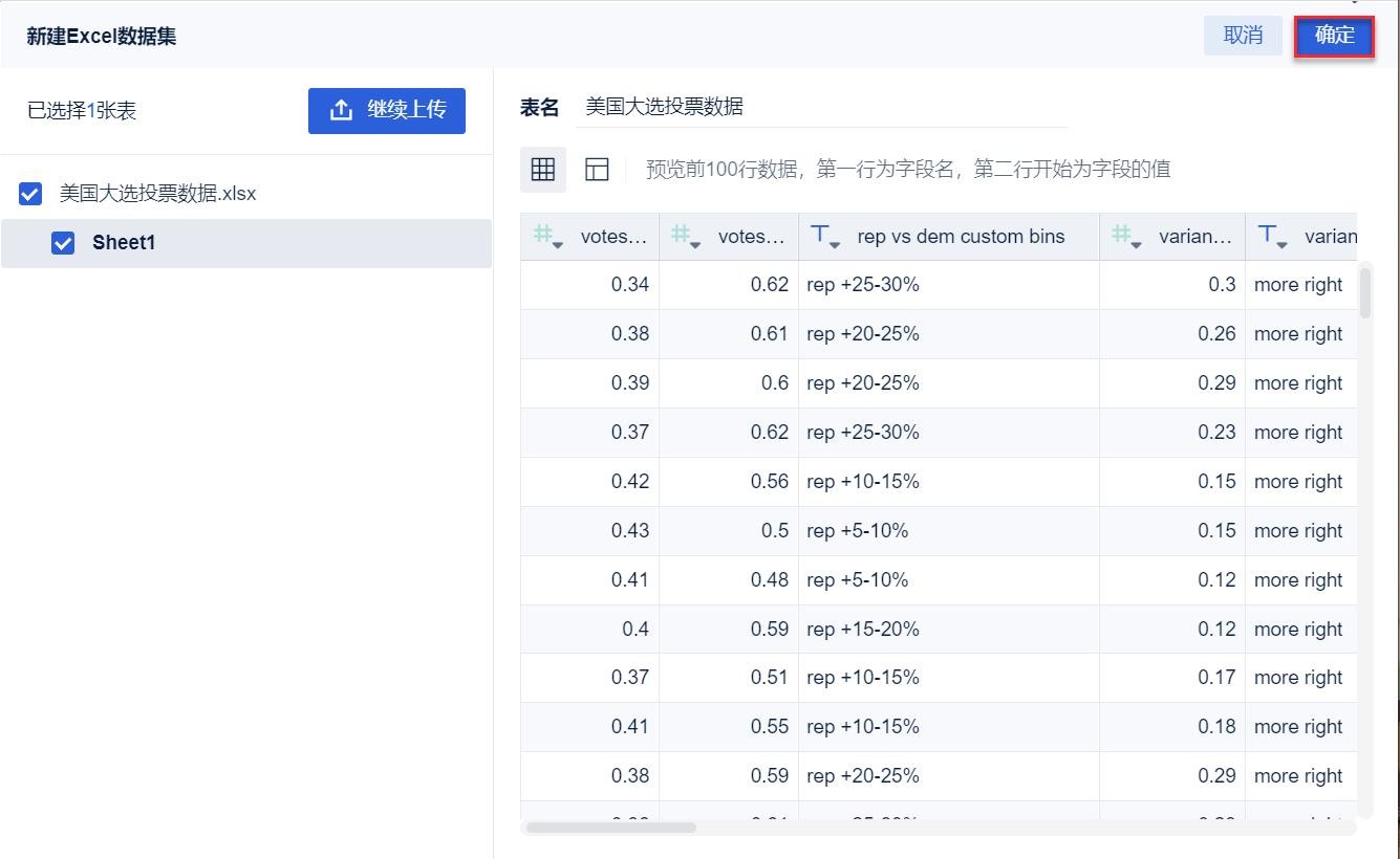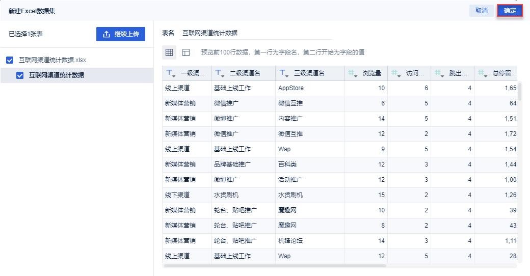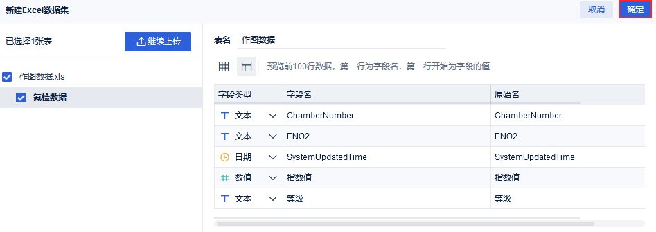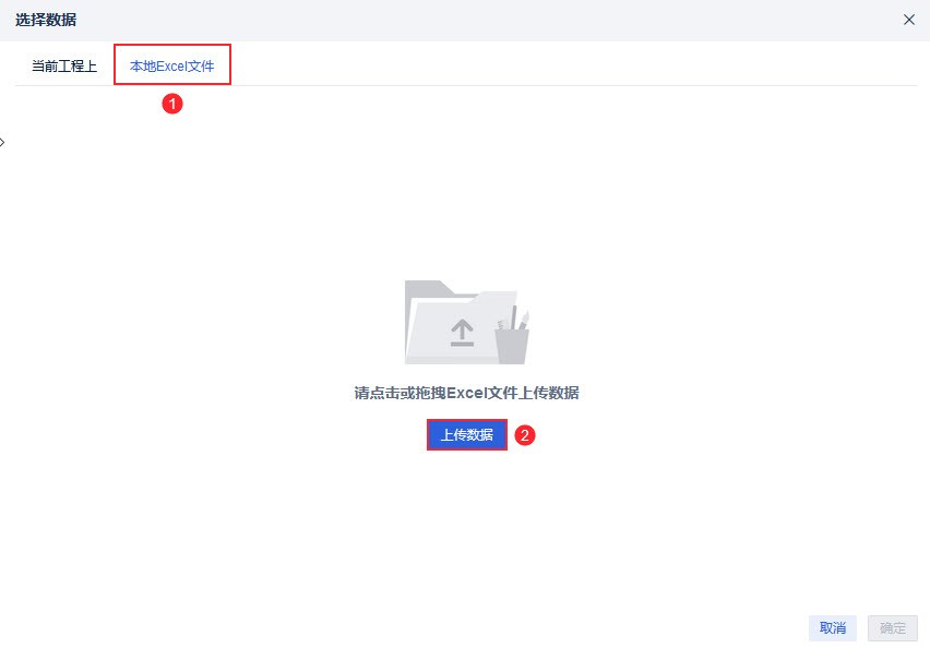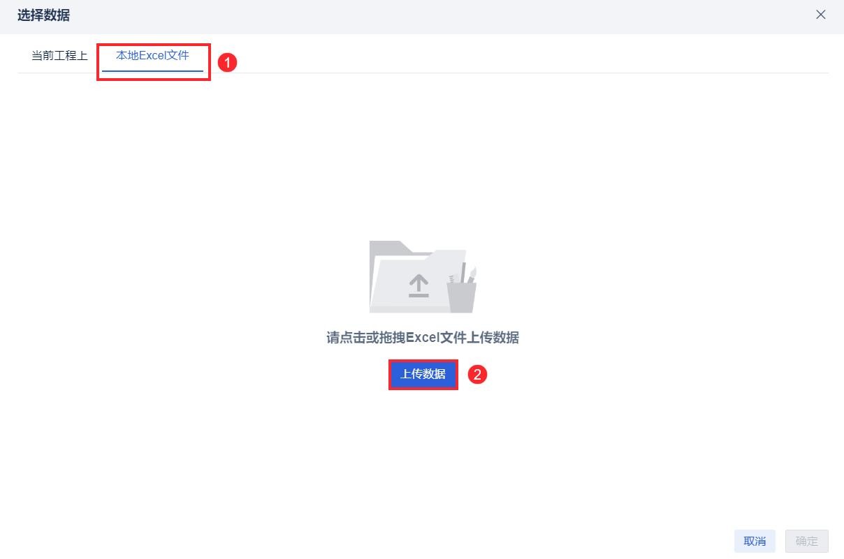 2)点击「本地Excel文件>上传数据」,上传表数据。如下图所示: