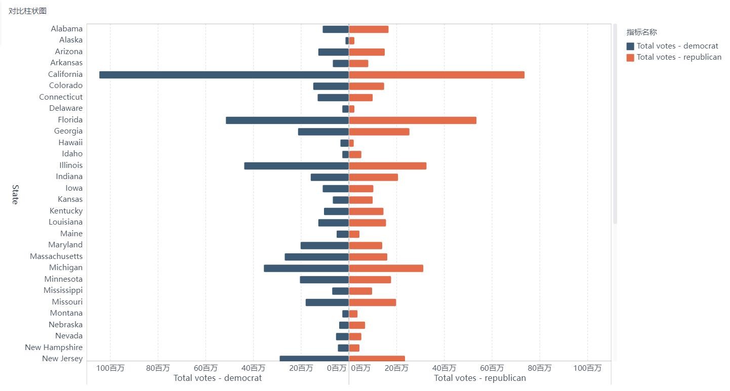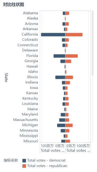 对比柱状图是一种以背靠背形式的条形图,主要用于展示同一维度下,两个指标的对比分析,便于更直观地看出对比差距。下图显示了美国大选各大洲得票情况对比,红色代表共和党,蓝色代表民主党,对比效果如图所示: