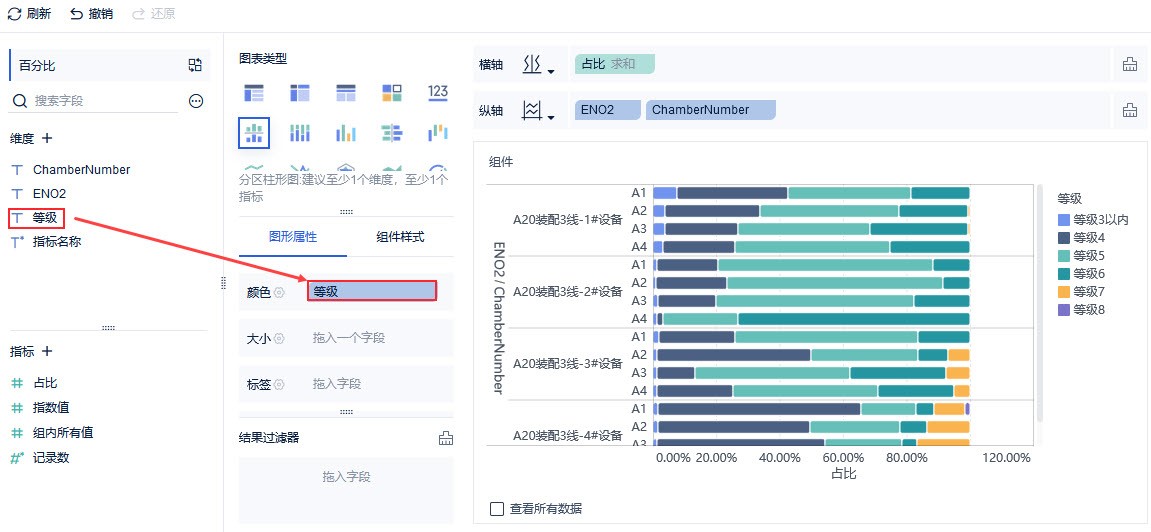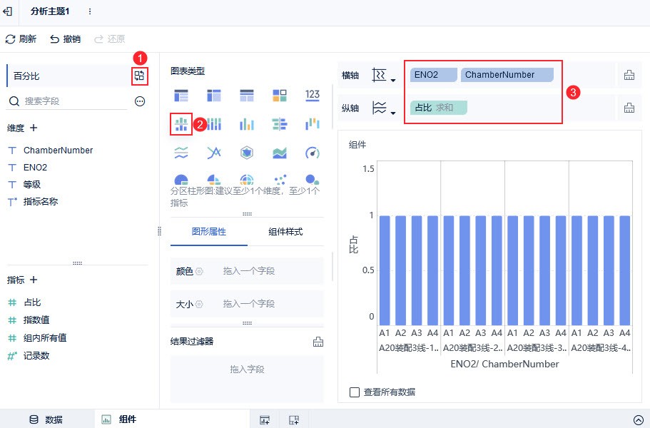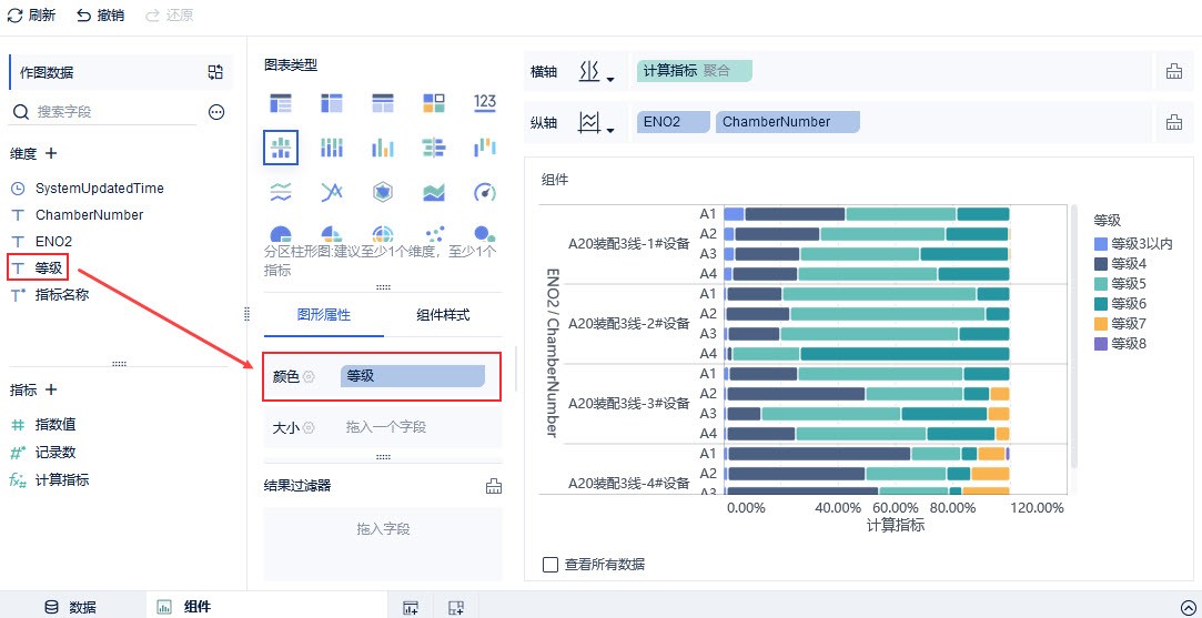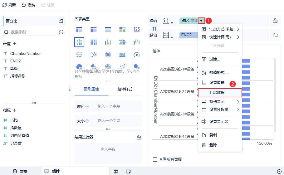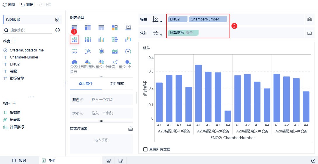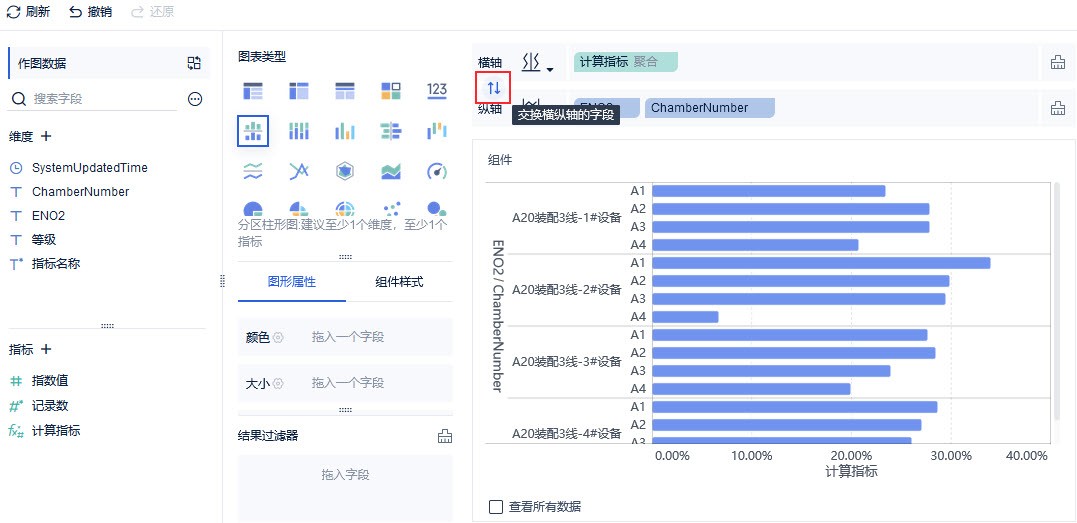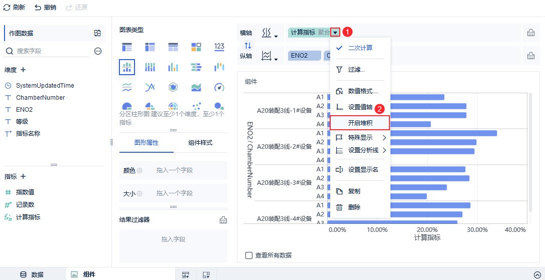 在图表类型下选择「分区柱形图」,将「ENO2」和「ChamberNumber」字段(即产线与车间)拖入横轴,「计算指标」字段拖入纵轴。如下图所示: