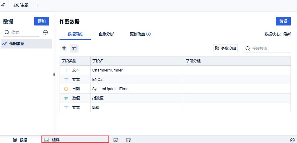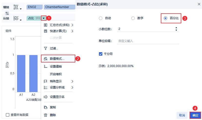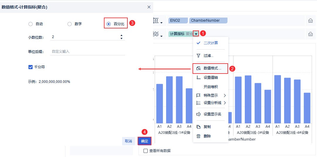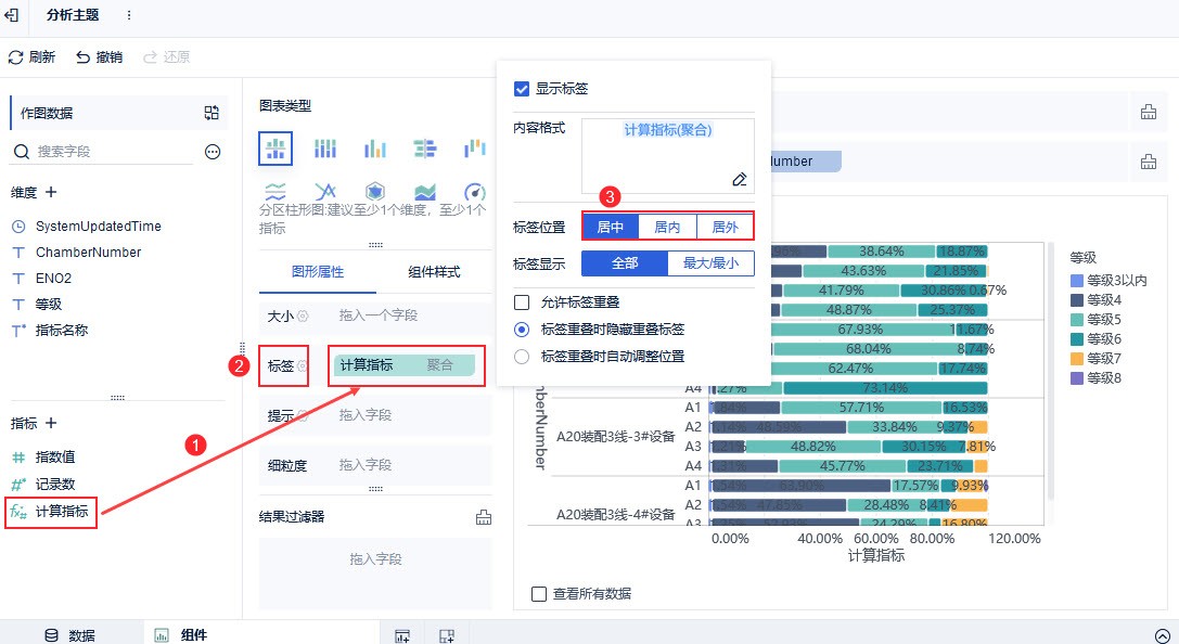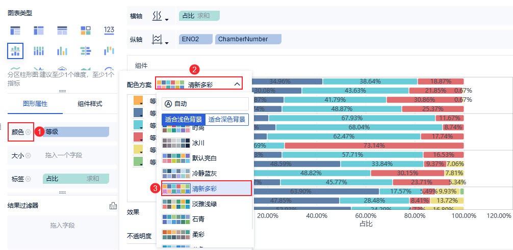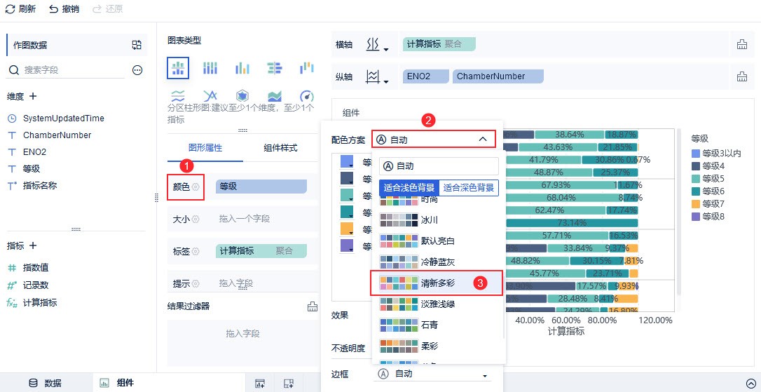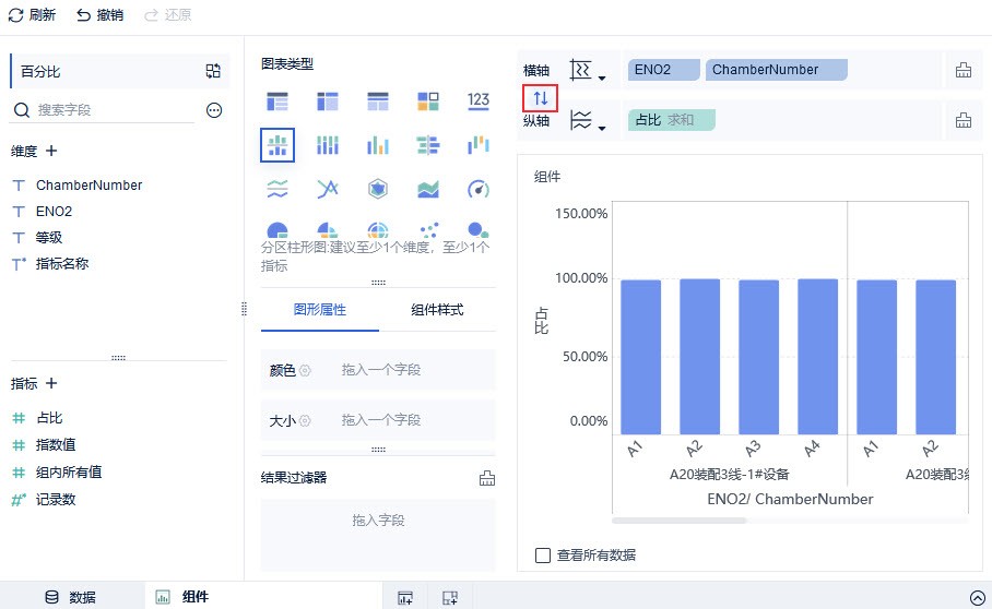 在图表类型下选择「分区柱形图」,将「ENO2」和「ChamberNumber」字段(即产线与车间)拖入横轴,「计算指标」字段拖入纵轴。如下图所示: