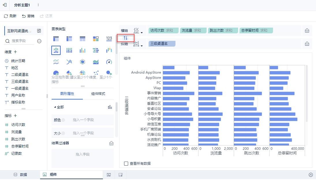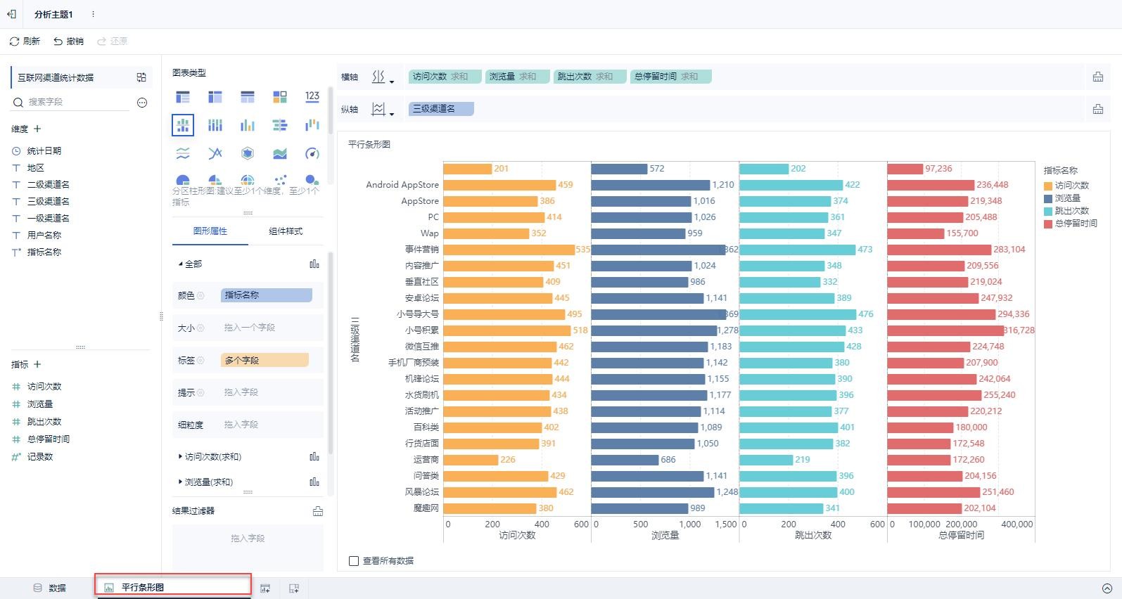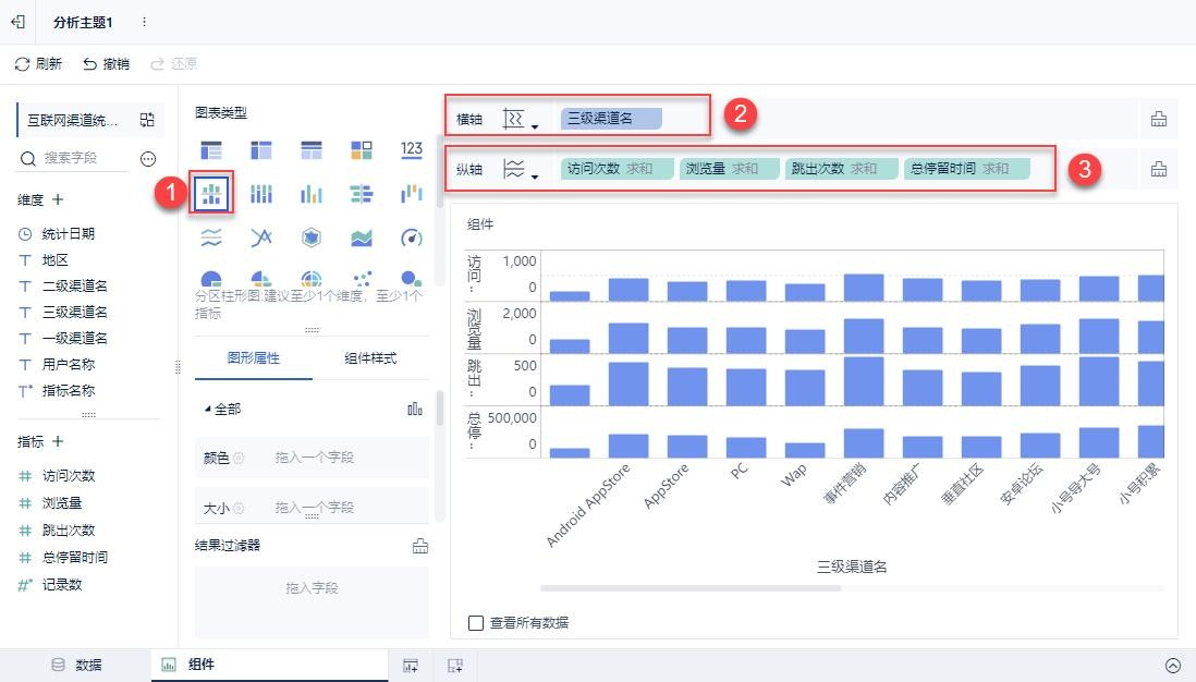 2)在图表类型下选择「分区柱形图」,将「三级渠道名」字段拖入到横轴中,「访问次数」、「浏览量」、「跳出次数」、「总停留时间」字段拖入到纵轴中。如下图所示: