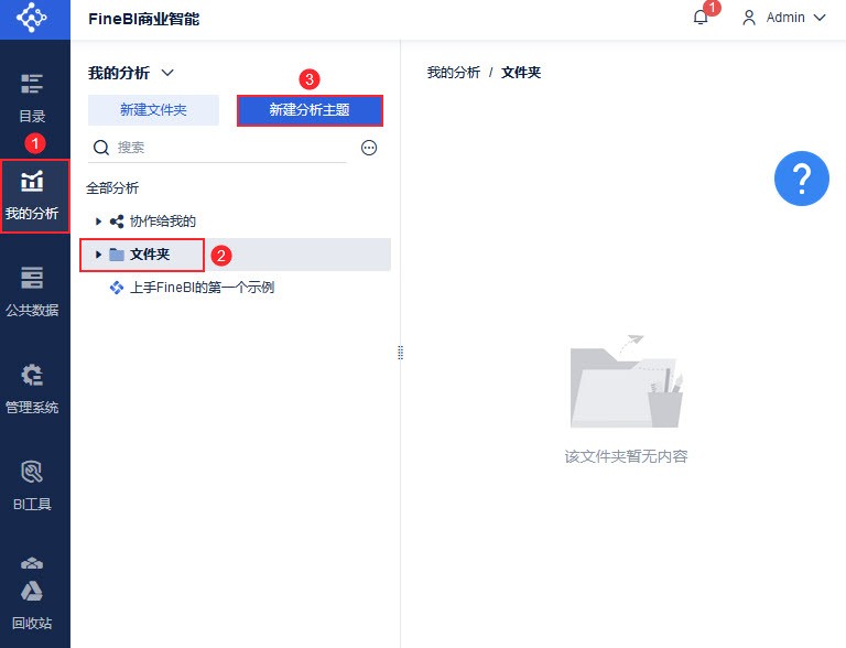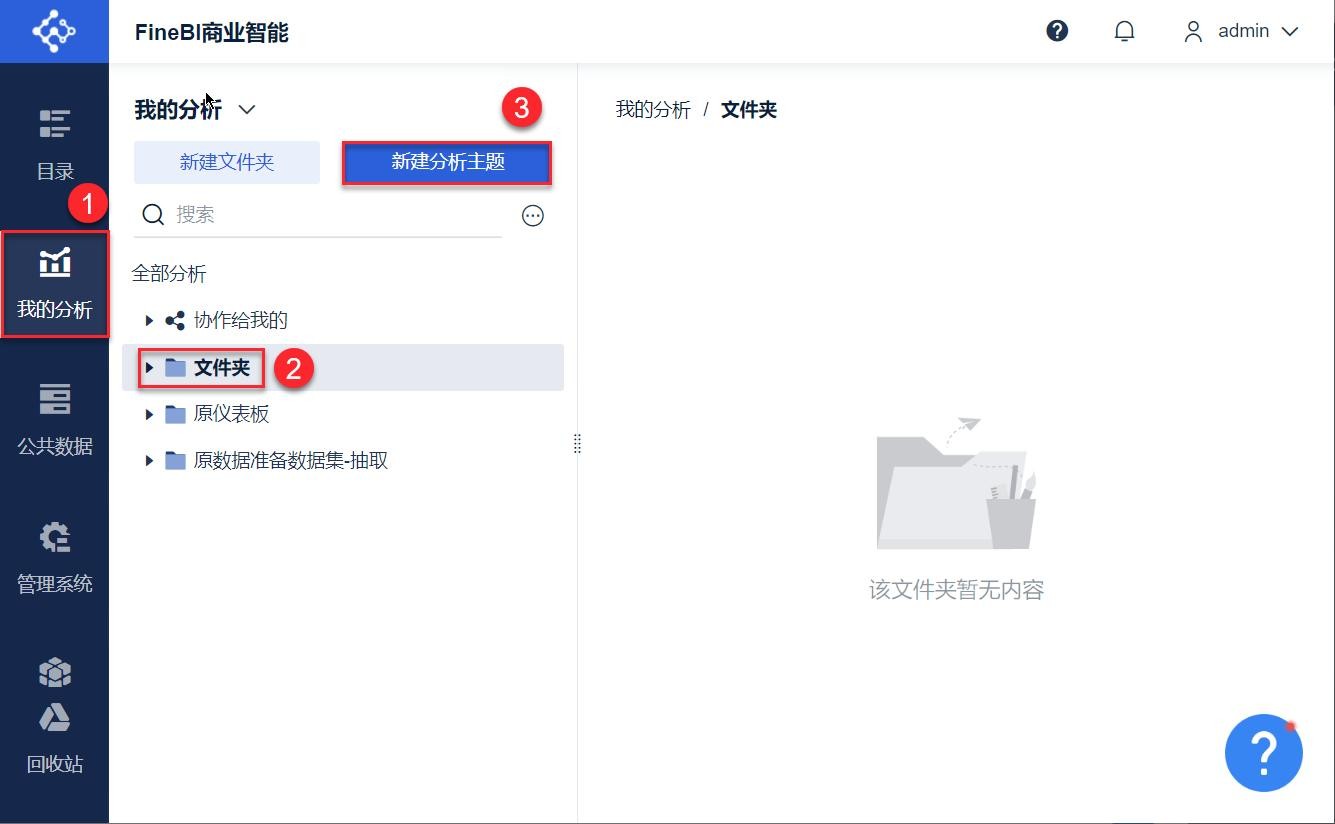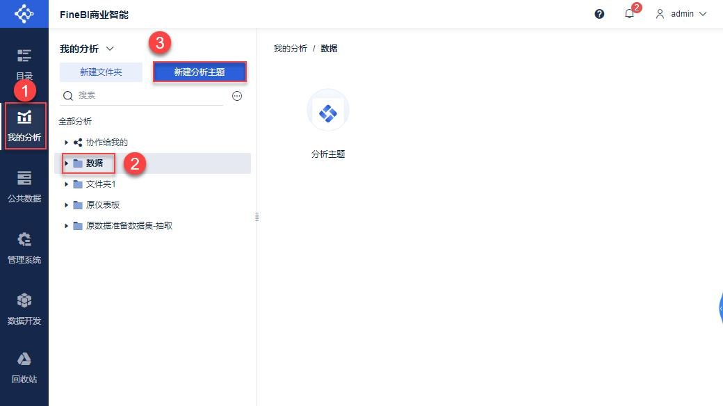 1)管理员进入系统,点击「我的分析」,选中某个文件夹,点击「新建分析主题」。如下图所示: