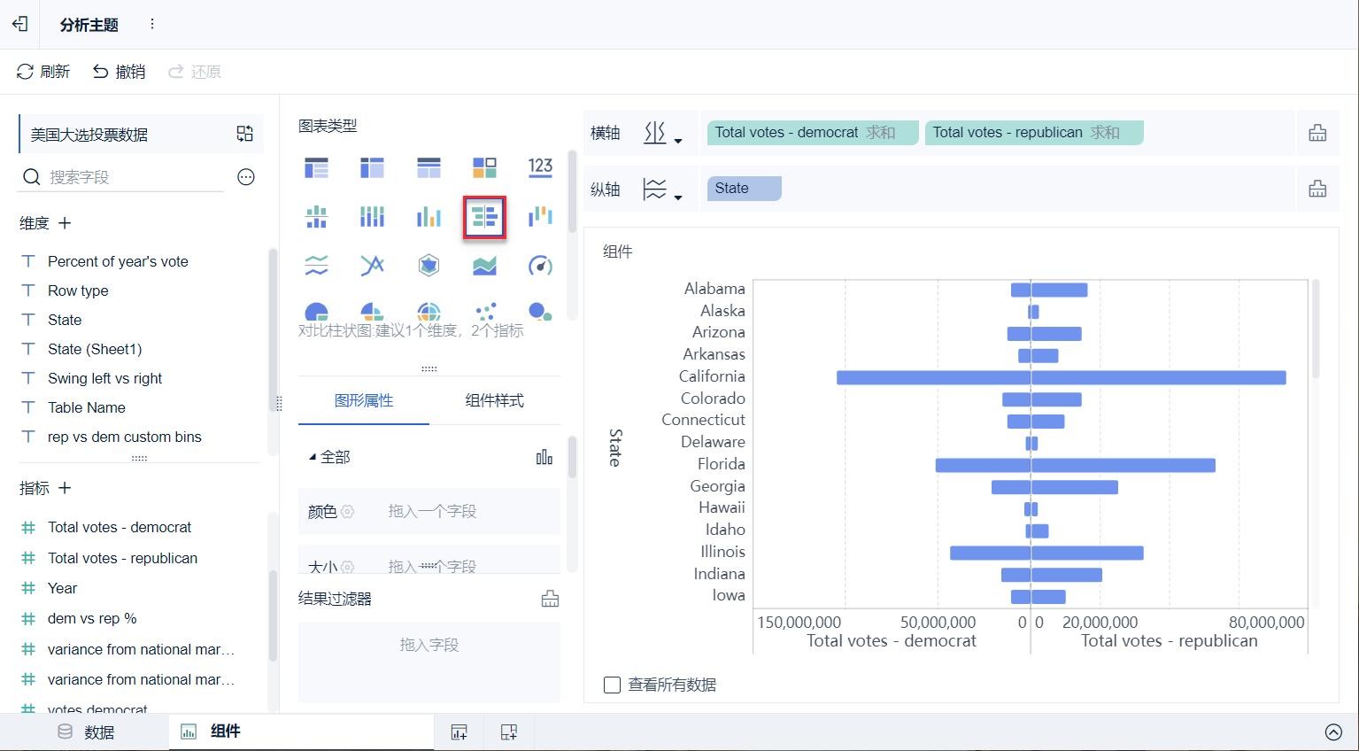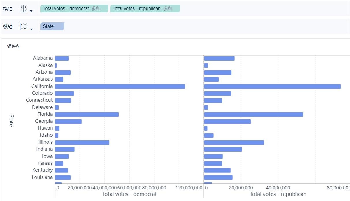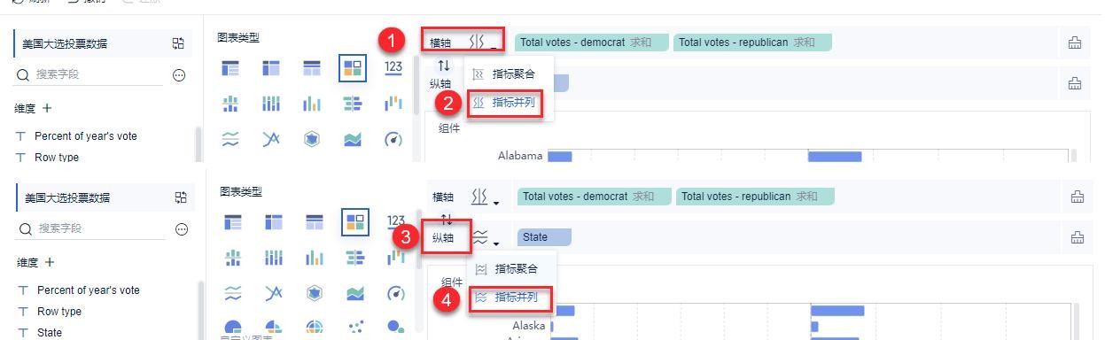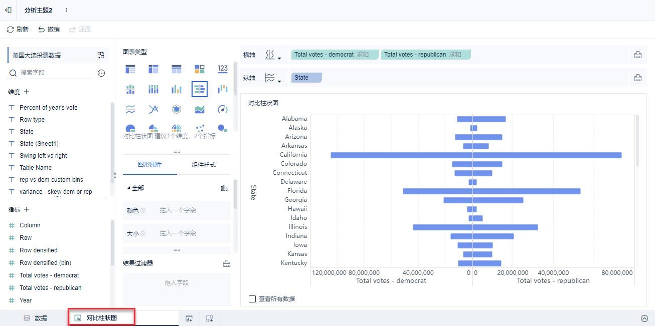 2)将「State」字段拖入到「维度」中,「Total votes - democrat」、「Total votes - republican」字段拖入到「指标」中,在图表类型下选择「对比柱状图」。如下图所示: