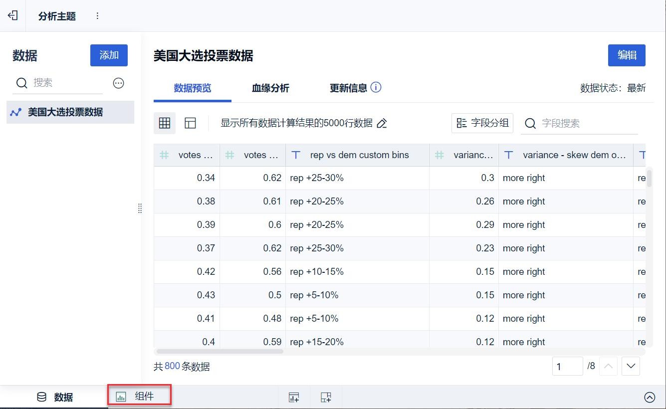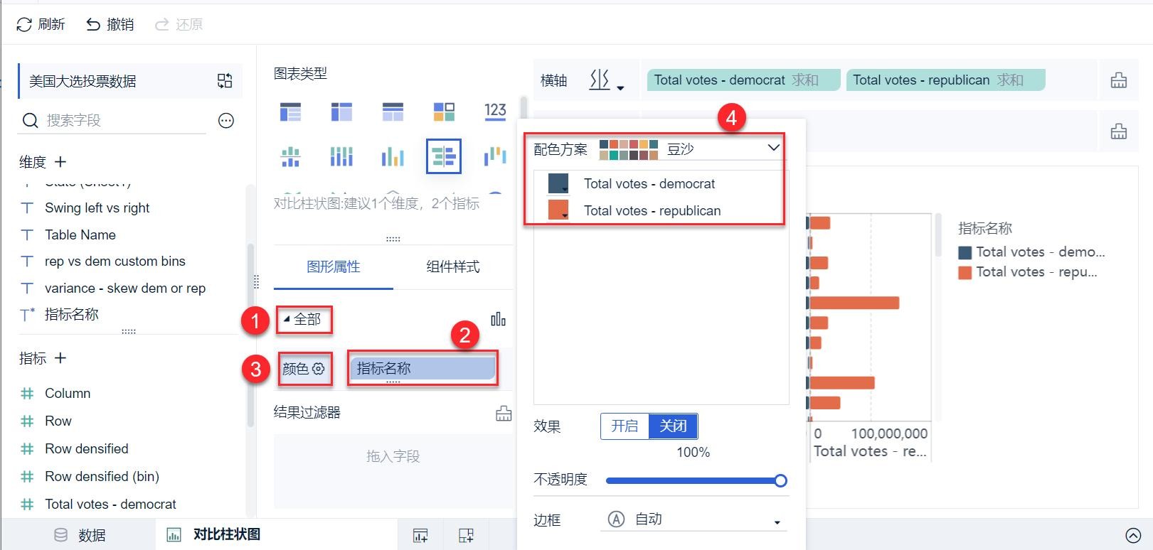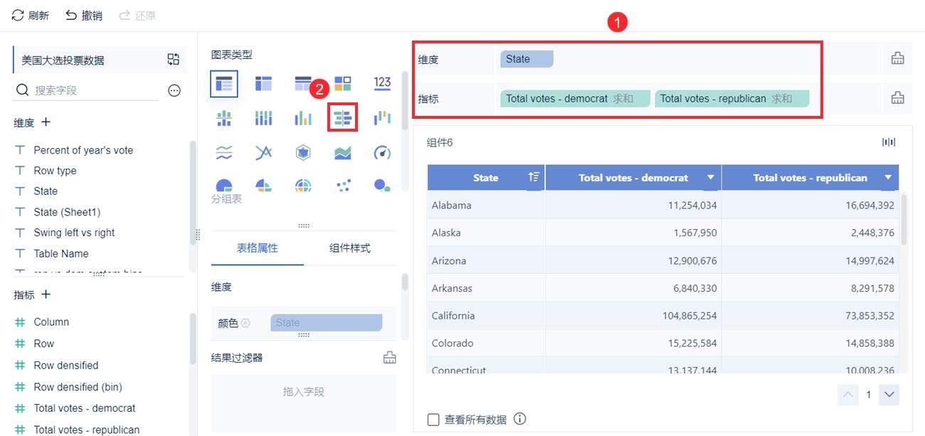2)将「State」字段拖入到「维度」中,「Total votes - democrat」、「Total votes - republican」字段拖入到「指标」中,在图表类型下选择「对比柱状图」。如下图所示: