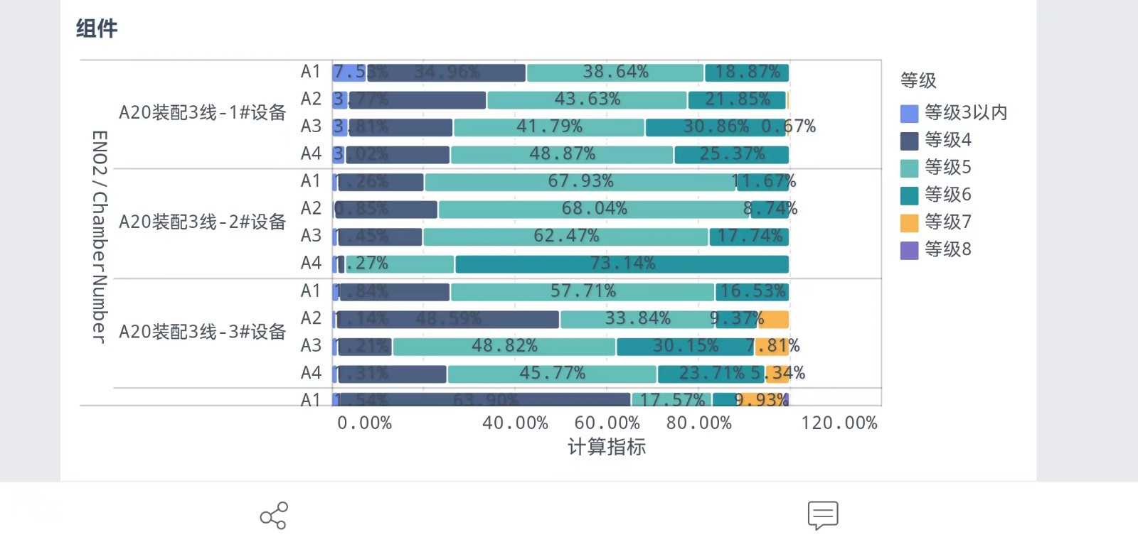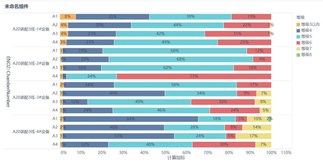 制造业有不同的产线,产线上有不同的车间,每个车间生产不同质量等级的产品。当需要根据产线、产线下的车间分类,统计不同质量等级的产品,用于判断不同生产线、车间的生产状况时,可以通过多系列百分比堆积柱形图实现。如下图所示: