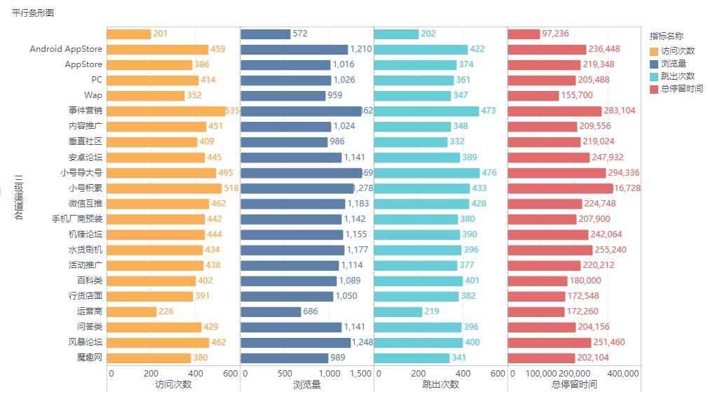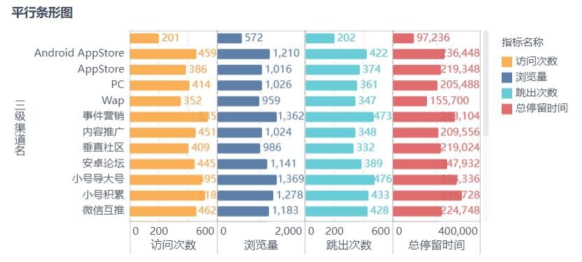 如下图显示了某互联网产品在三级分销渠道中的浏览访问次数等指标的对比:
