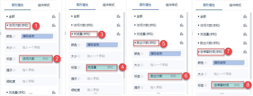 分别将「访问次数」、「浏览量」、「跳出次数」、「总停留时间」拖入对应图形属性的「标签」栏中,将数值显示到图表中。如下图所示: