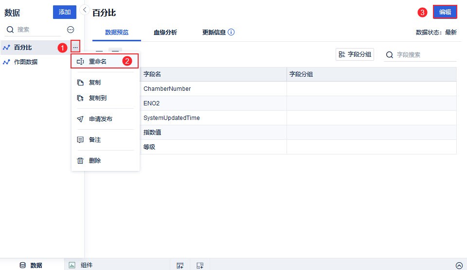 1)复制「作图数据」表,并重命名表名为「百分比」,点击编辑按钮。如下图所示: