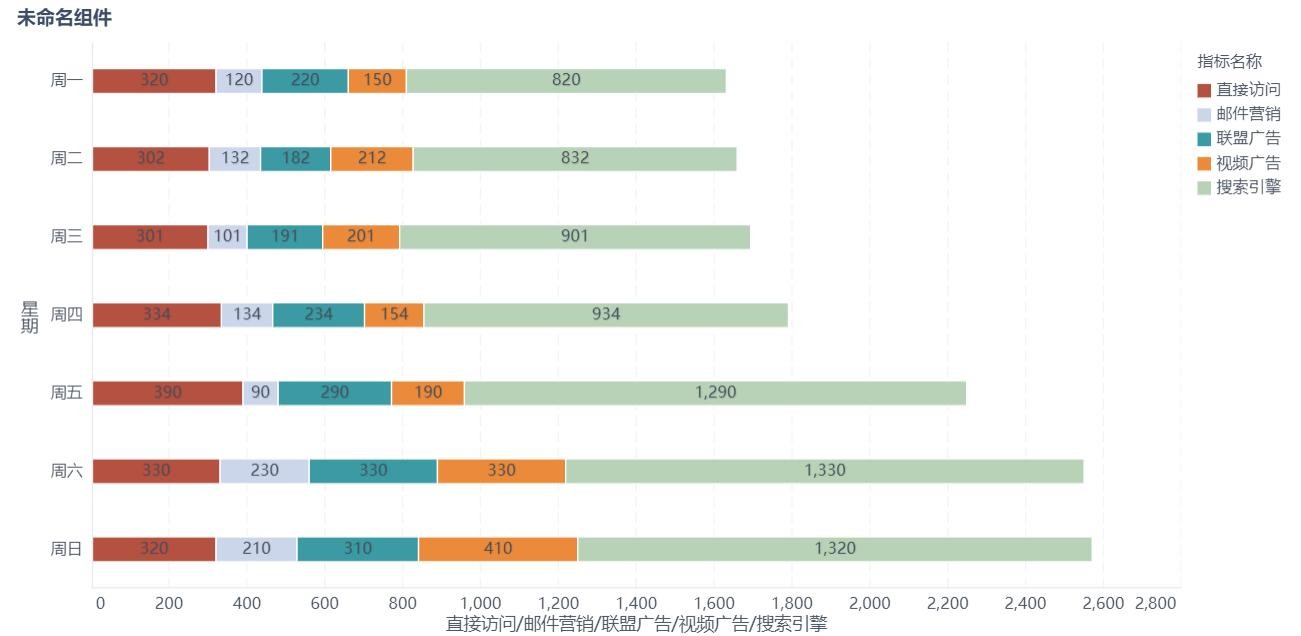 用户横轴拖入两个指标字段,纵轴拖入一个维度字段,图表效果如下图所示: