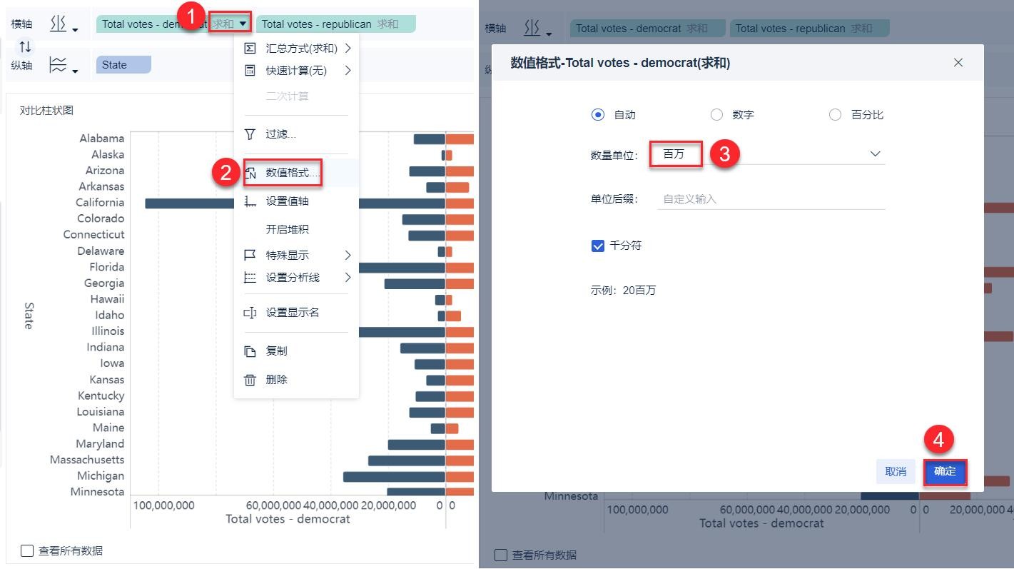 分别在Total votes - democrat和Total votes - republican字段下点击下拉,选择「数值格式」,点击数量单位「百万」,点击「确定」,如下图所示: