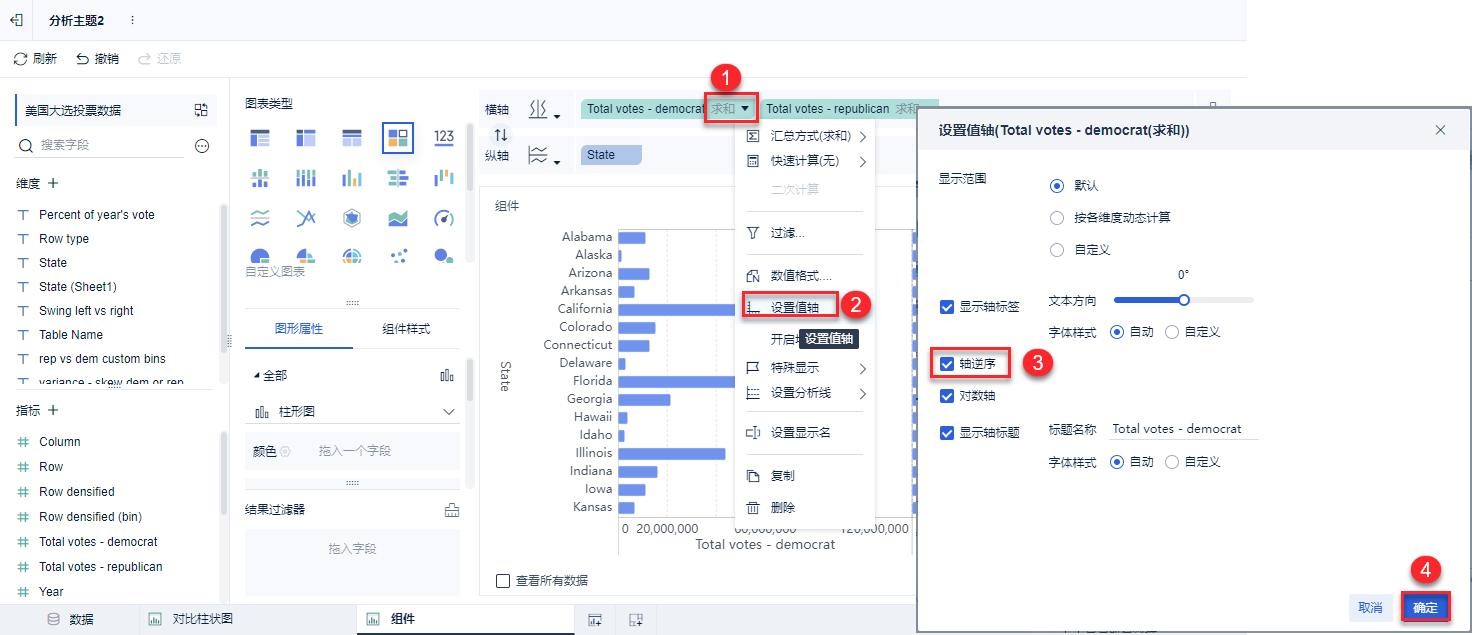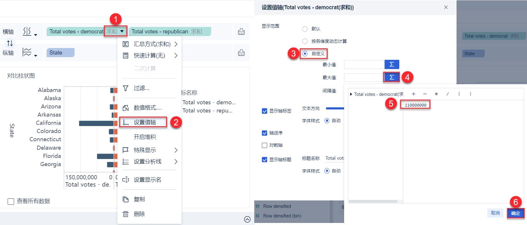 分别在Total votes - democrat和Total votes - republican字段下点击下拉,选择「设置值轴」,勾选「轴刻度自定义」,点击「最大值」设置,输入110000000,点击「确定」,如下图所示: