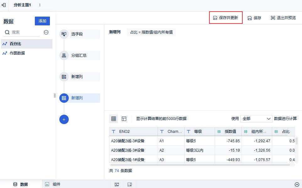 添加计算字段,命名为「计算指标」,值为SUM_AGG(指数值)/TOTAL(SUM_AGG(指数值),1,"sum")。如下图所示: