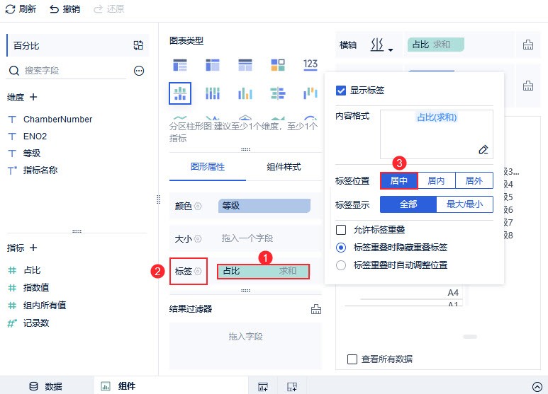 将「占比」字段拖入标签栏,点击「标签」栏,设置标签「居中」显示。如下图所示: