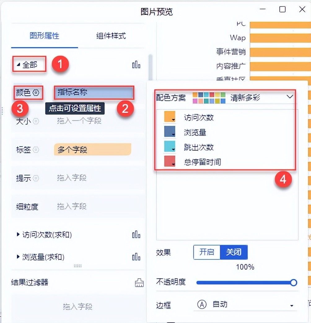 将「指标名称」拖入「全部」下的颜色栏,点击颜色设置,配色方案选择「清新多彩」。如下图所示: