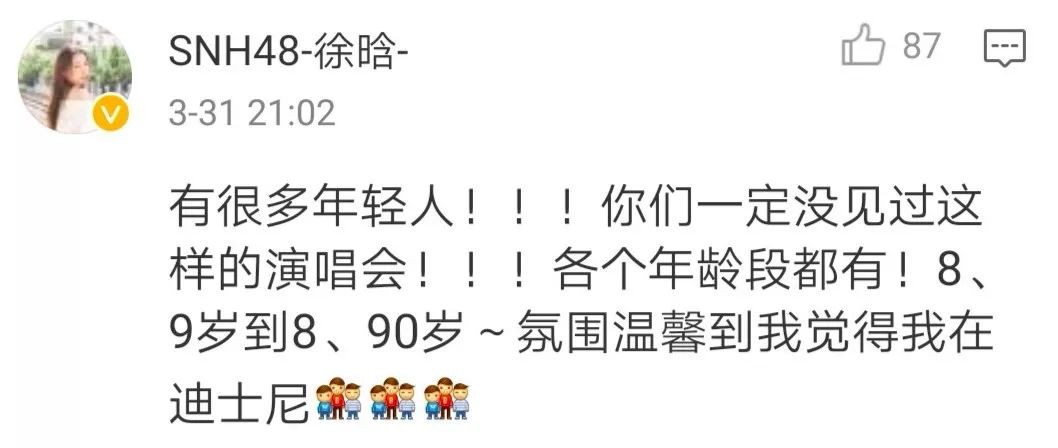 “你一定没见过这样的演唱会。各个年龄段都有,8、9 岁到 80、90 岁。氛围温馨到觉得自己在迪士尼。”