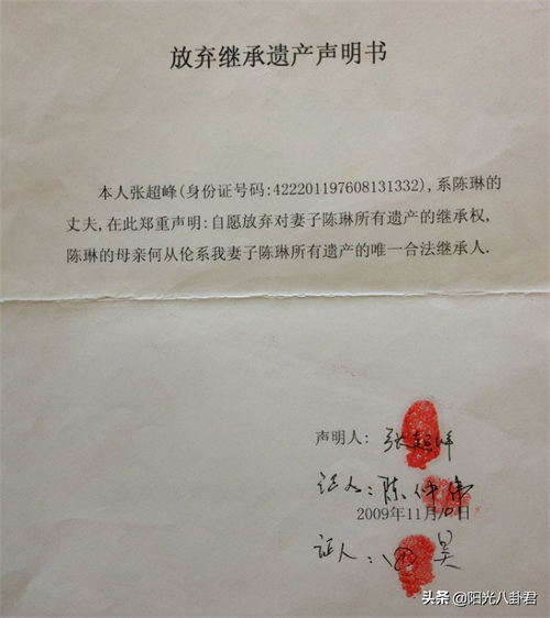 不过,随着陈母公布出当年张超峰签署的“放弃继承遗产声明书”后,