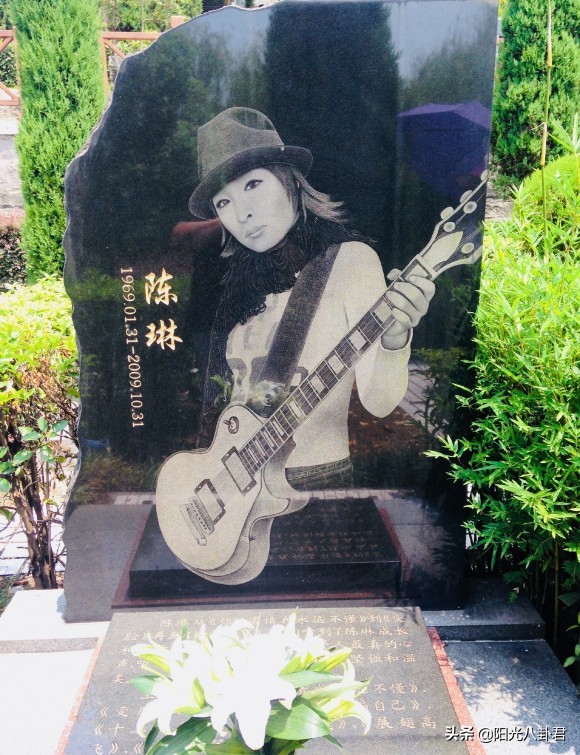 而墓碑上的陈琳则戴着帽子、抱着吉他,