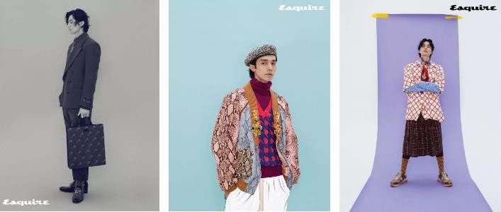 到了《Esquire》的十月刊里又是截然不同的感觉——复古慵懒,眼神淡淡、肢体舒展,把纷繁复古、很难驾驭的Gucci诠释得堪称精彩: