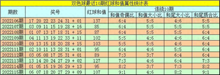 双色球红球最近10期开出和值分别为:137、85、87、102、103、95、89、127、95、107。