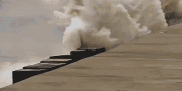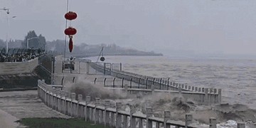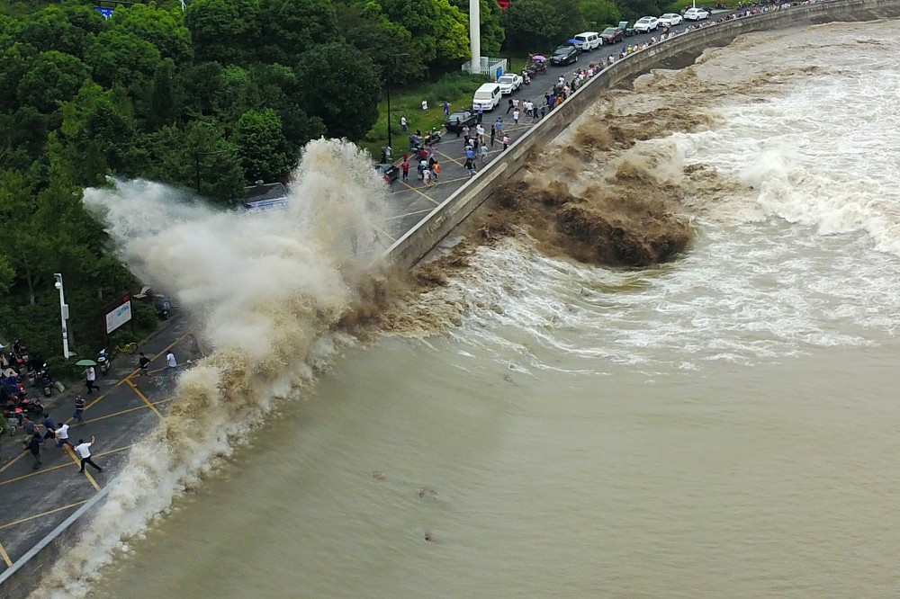 当汹涌的钱江潮水冲上江堤时,观潮游客仍被吓得四散奔逃。