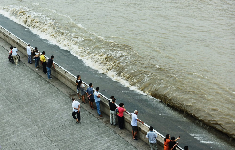 在江边观潮的市民和游客不用提早跑离江堤,可以淡定观潮。