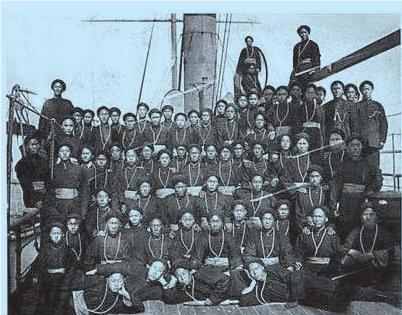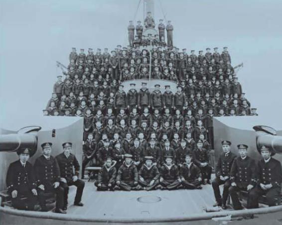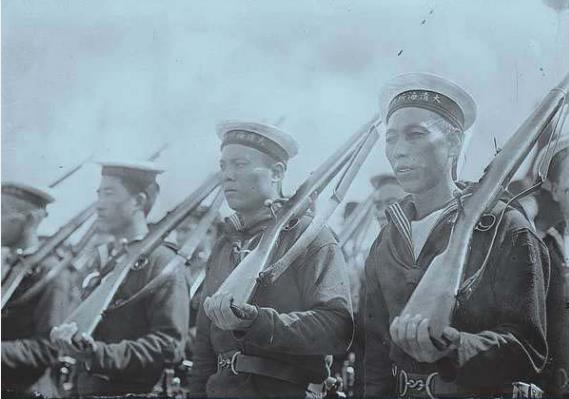 前一张图为甲午战争时期“致远”舰的全体官兵合影,后面一张图为“海琛”号上全体官兵合影一此时的大清水师已经全部着英式服装, 进行英式操练。