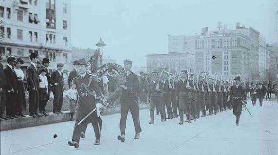 “海圻”号水兵列队前往格兰特将军陵墓敬献花图途中。格兰特和李鸿章私交不错
