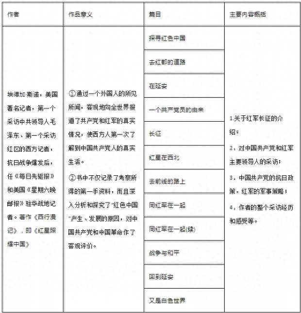 1.《红星照耀中国》一书的原名是《西行漫记》,这是美国的著名记者埃德加·斯诺的著作,他是第一个采访中国共产党的领导人毛泽东、第一个采访红区的西方记者。