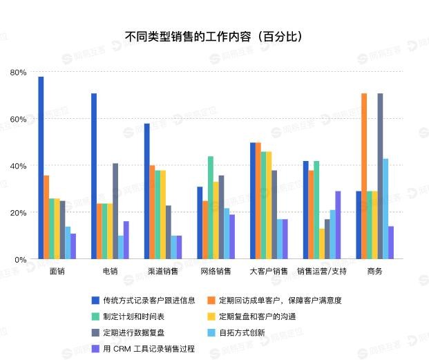 虽然销售的薪资普遍较高,尤其是大客户销售,一般直接面向政府机构、事业单位、上市公司、集团公司等大型客户,在薪酬回报上也相对丰厚,但高薪的背后不仅需要在业务上有所突破,同时也要求其有自驱学习能力。报告显示,记录客户信息、跟进工作进度是销售工作中最主要的内容,尤其在面销和电销领域,占比高达78%、71%。此外,制定计划和时间表在各类销售业务中也颇为重要。