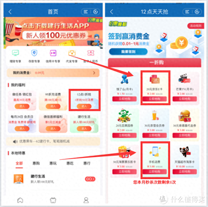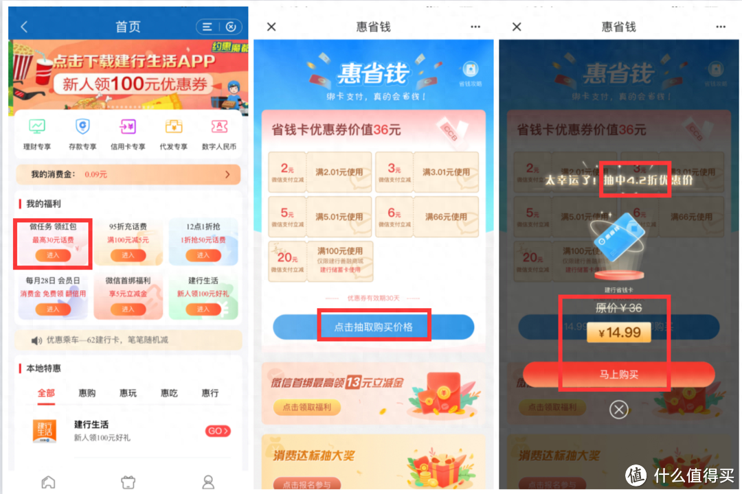 建设银行最高36元优惠, 这个是需要抽奖购买的, 我手气不好, 要14.99元, 瞬间就没有动力了。