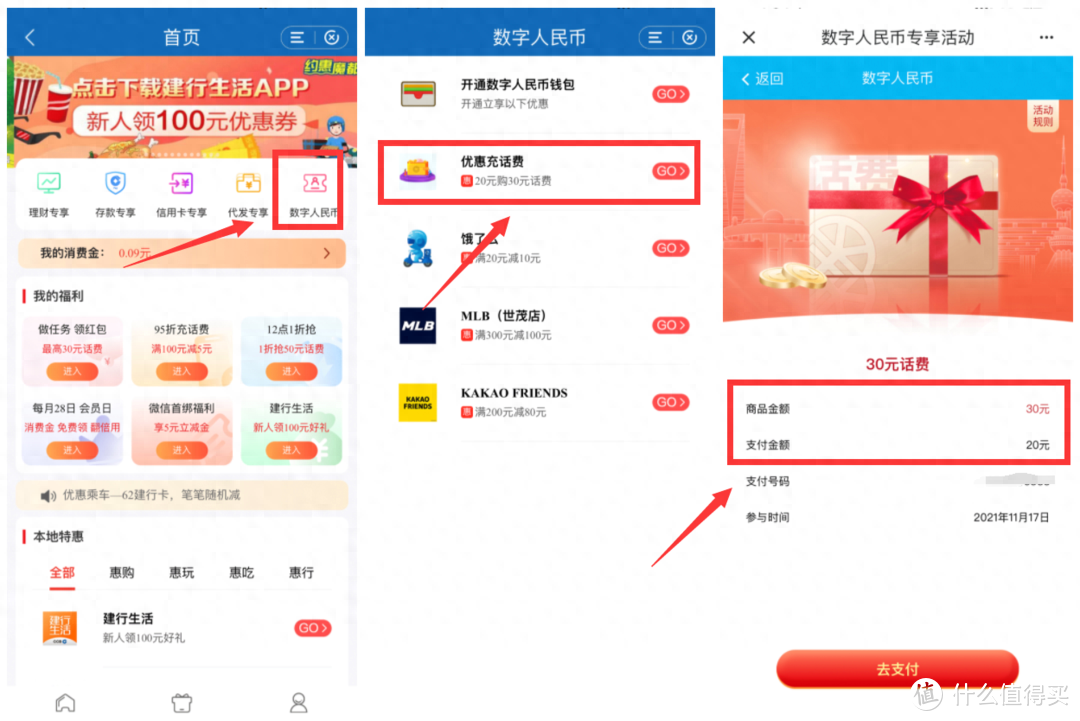 建行数字人民币, 支付20元, 充30元