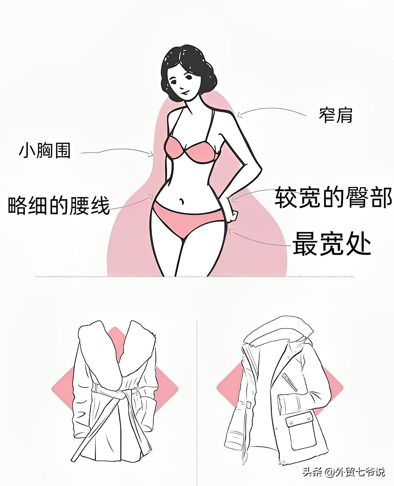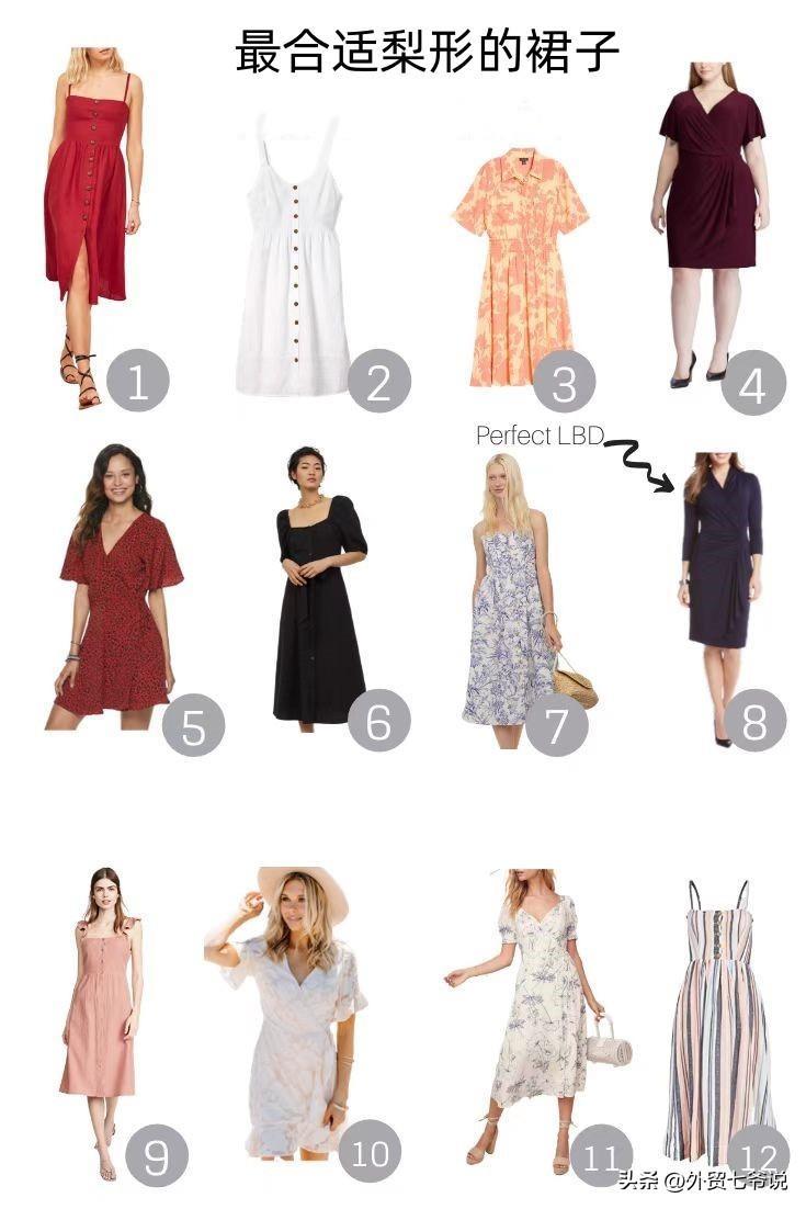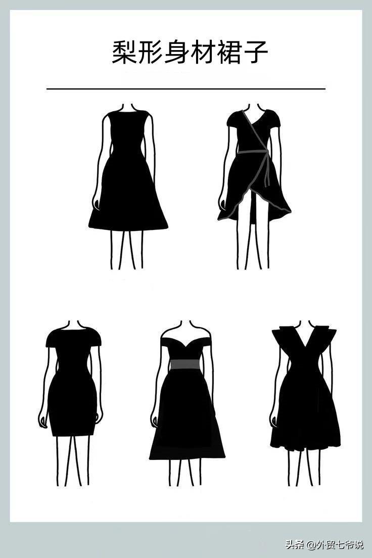 那就是首先要明确腰线,其次避免臀部过多的细节或装饰,减少堆积,尽量让臀线翘出,最后是通过譬如鲜艳的花色、裸漏的肩或细长的脖颈,以及较宽的衣领和合适的内衣等来平衡肩胸部的宽度或重量感,让目光聚焦点上移!