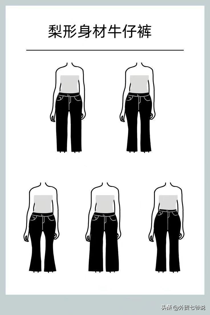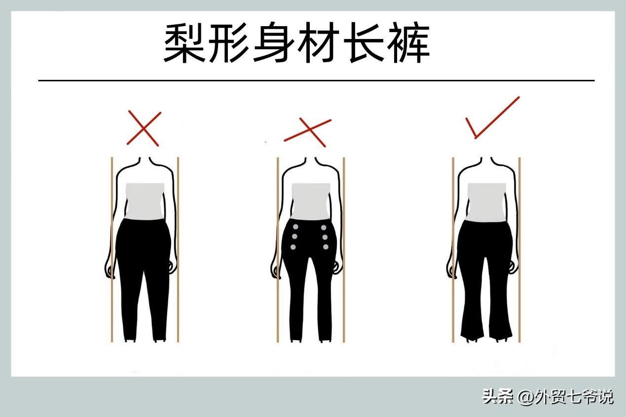 小脚裤、铅笔裤、锥型裤不合适,特别不推荐紧身小脚、腰臀部还有装饰的裤子,它会让你的臀部、屁股显得更肥大。直筒裤、喇叭裤、阔腿裤、靴裤更好!