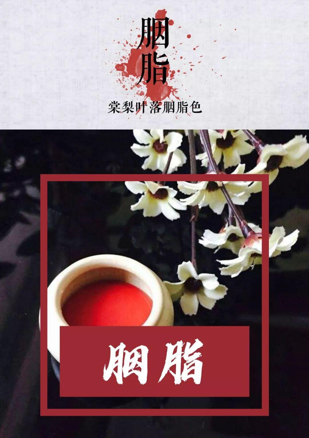 胭脂红,色暗红。古时用红蓝花、茜草、紫梗等植物制成的颜料。
