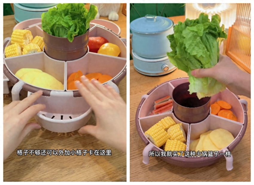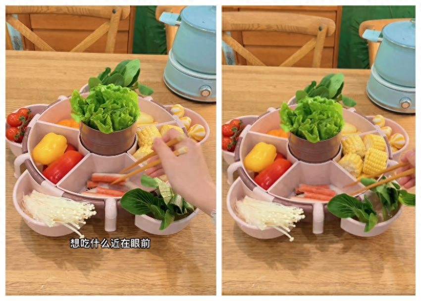 为此专门买了这种火锅拼盘,双层分格设计,一层放菜,一层沥水,按需自由组合;底座能360度旋转,轻轻一转,就能夹菜,超方便。