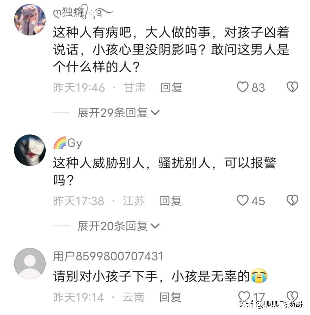 接着男子提高音量,几乎是咆哮着叫道:你为什么不叫小朋友讲话,你是怎么当爹的?