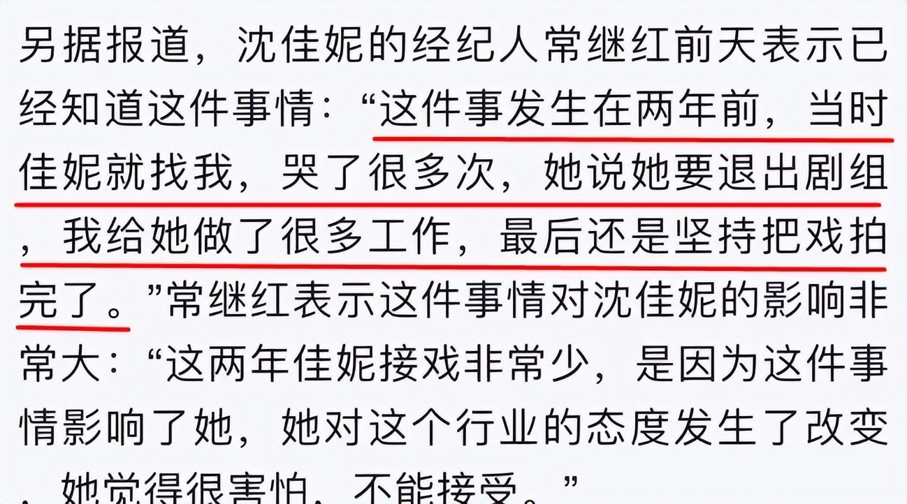 就在众说纷纭的时候,沈佳妮的经纪人出面回应了,并且也证实沈佳妮说的都是真的,除此之外,经纪人还说当时沈佳妮哭着要退剧组,是她苦口婆心让她坚持把戏拍完的。
