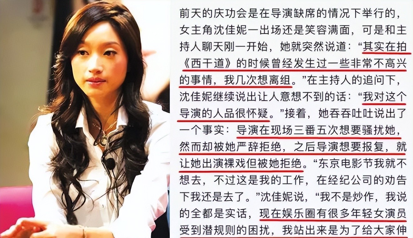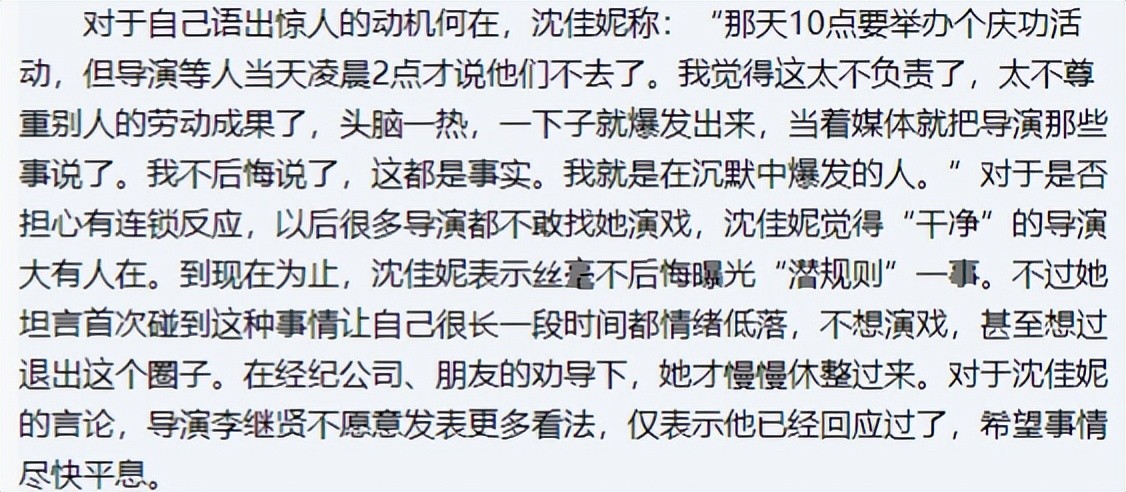 于是头脑一热,一下子就爆发出来,当着媒体就把导演那些事说了,不过沈佳妮也表示自己不后悔这样做,并且也表示自己说的都是事实。
