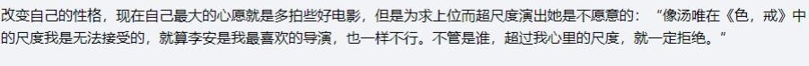 “为了出名而做出过大尺度的表演,她是不愿意的,就像汤唯在《色,戒》里的那种大胆程度,她接受不了,哪怕是李安这样她很喜欢的导演,也不行,只要超过了她心中的底线,不管是谁,她都会坚决说不。”