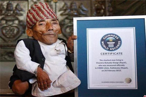 世界上最矮的人是钱德拉·巴哈杜尔·唐吉,他是尼泊尔人,身高只有0.546米。2012年2月22日,72岁老人钱德拉·巴哈杜尔·唐吉抵达首都加德满都,接受了媒体的采访,唐吉计划在26日接受吉尼斯的认证,成为世界上最矮的男人,到时他将打破菲律宾Junrey Balawing所创造的身高仅60厘米的纪录,但他如今已经逝世。