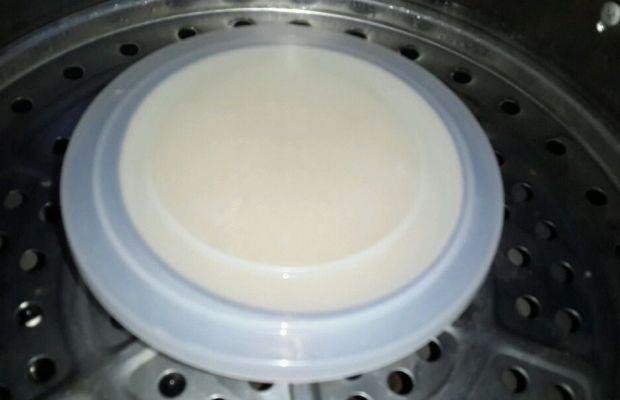 第四步:碗上盖上盖子,也可以用保鲜膜,蒸锅里加好水烧开,把蒸碗放入蒸锅。