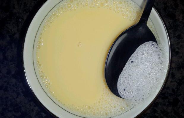 第三步:加入适量的盐,继续打散,用小勺撇去上面的一层泡沫不要。