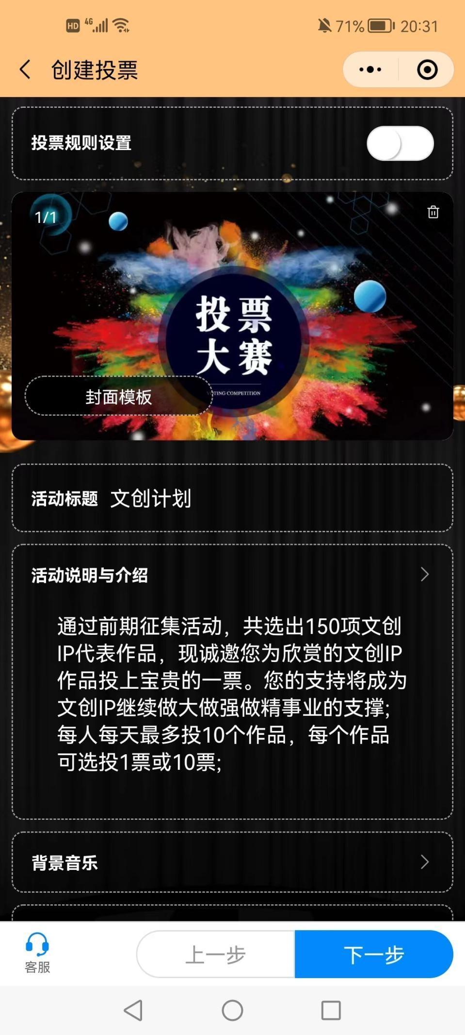 活动介绍填写完毕,我们选择一张好看的封面,然后进行投票设置,并且选择一个好看的投票样式,确认无误后,点击下一步。