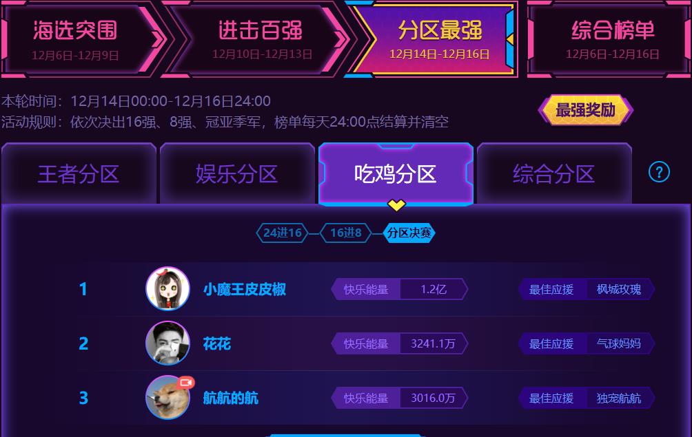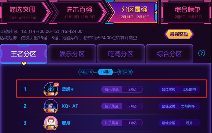 最终在昨晚的触手年度盛典16进8中,蓝烟以2亿触手币的快乐能量登榜第一顺利晋级,这也是粉丝送给蓝烟直播三周年纪念日的礼物,并且蓝烟还顺利拿下了15号的“今日最佳”称号,排面十足之余也看出蓝烟的粉丝有多热情!