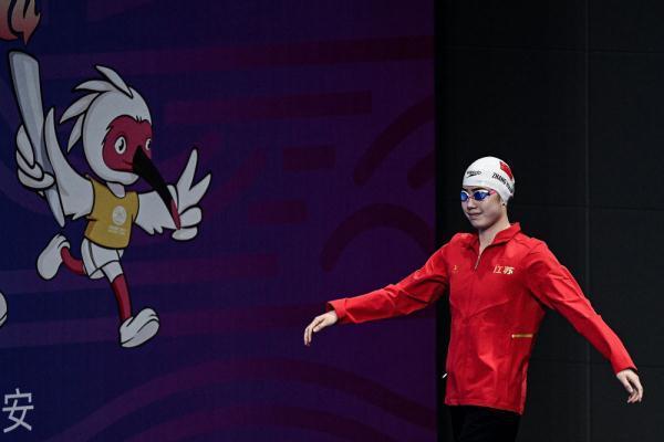↑江苏队选手张雨霏在比赛前入场,她以24秒29的成绩获得亚军。新华社记者 吴刚 摄